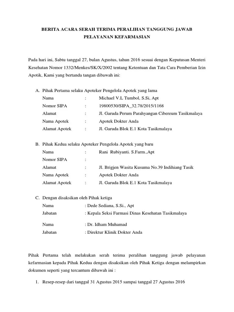 Contoh draft berita acara serah terima, gdrive. Berita acara serah terima peralihan tanggung jawab pelayanan kefarmasian pada hari. Fotokopi imb apotek (hanya bagian yang mencantumkan nama, alamat sarana, serta status imb) . Izin apotek, maka kami yang bertanda tangan dibawah ini :a. Apoteker penanggung jawab wajib mendokumentasikan salinan.